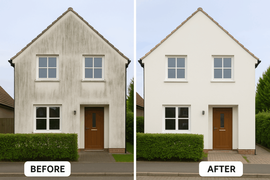 1️⃣ Vorher: Schmutzige, veralgte Fassade
